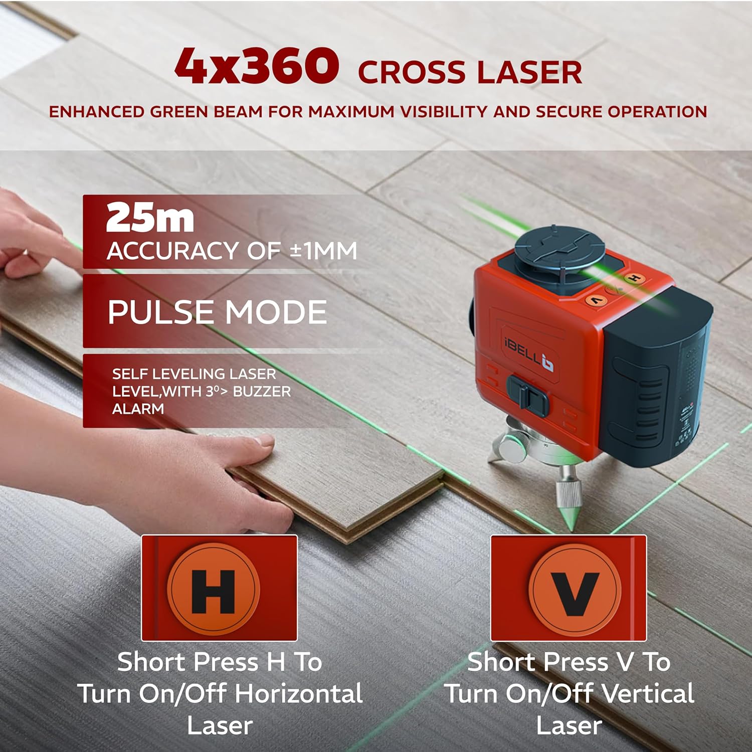 iBELL IBL LL5-16 Professional 16-Line Green Beam Self-Leveling Laser Level, 8 Horizontal & 8 Vertical, ±1mm Class II,Tripod Compatible, with 2 Rechargeable Batteries for Home, DIY & Professional Use
